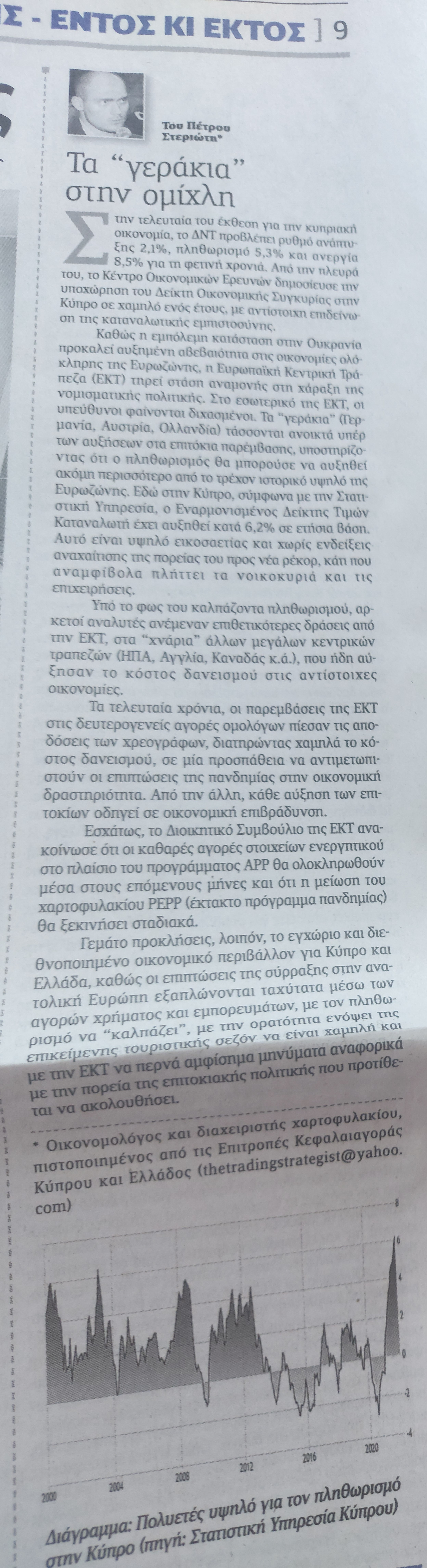 Γεμάτο προκλήσεις, λοιπόν, το εγχώριο και διεθνοποιημένο οικονομικό περιβάλλον για Κύπρο και Ελλάδα, καθώς οι επιπτώσεις της σύρραξης στην ανατολική Ευρώπη εξαπλώνονται ταχύτατα μέσω των αγορών χρήματος και εμπορευμάτων, με τον πληθωρισμό να “καλπάζει”, με την ορατότητα ενόψει της επικείμενης τουριστικής σεζόν να είναι χαμηλή και με την ΕΚΤ να περνά αμφίσημα μηνύματα αναφορικά με την πορεία της επιτοκιακής πολιτικής που προτίθεται να ακολουθήσει.