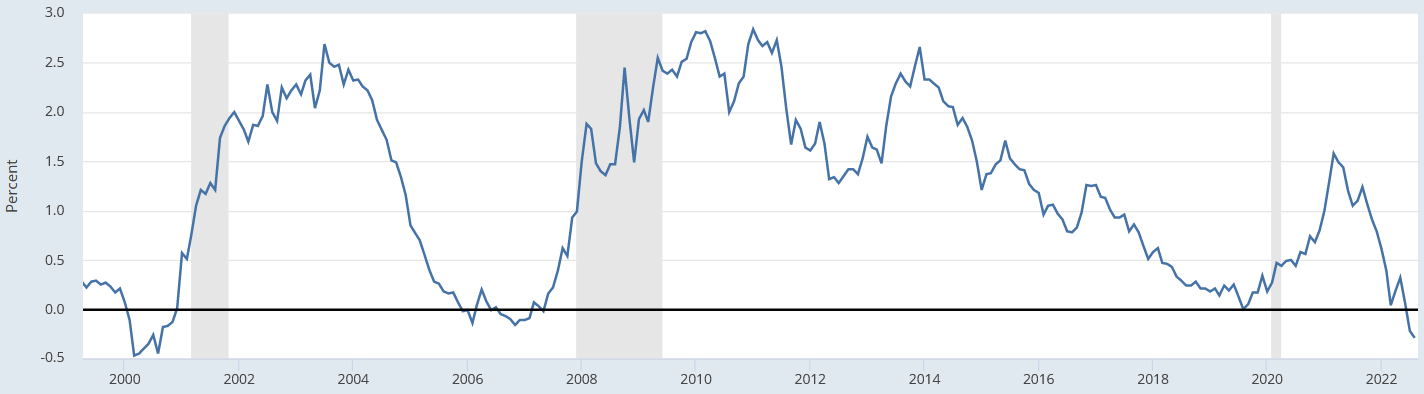Εν τω μεταξύ, η διαφορά αποδόσεων (yields) μεταξύ των 2-ετών και των 10-ετών κρατικών ομολόγων ΗΠΑ έχει υποχωρήσει στο χαμηλότερο σημείο των τελευταίων 22 χρόνων. Ιστορικά, οι εκτεταμένες περίοδοι αντιστροφής της χρονικής καμπύλης επιτοκίων τείνουν να προμηνύουν μελλοντικές περιόδους οικονομικής ύφεσης. Επί παραδείγματι, η παρατεταμένη εμφάνιση του φαινομένου της αντεστραμμένης καμπύλης αποδόσεων το 2000 μπορούμε να πούμε ότι αποτέλεσε πρόδρομο δείκτη (leading indicator) του «σκασίματος της φούσκας» της μετοχικής αγοράς υψηλής τεχνολογίας μεταξύ 2001-2003. Αντίστοιχα, η αρνητική κλίση της επιτοκιακής καμπύλης τη διετία 2006-2007 προμήνυσε την παγκόσμια ύφεση και στη συνέχεια την παγκόσμια χρηματοπιστωτική κρίση του 2008-2009. Βέβαια τόσο σε αυτές τις περιπτώσεις, όπως και πάντοτε άλλωστε, «όποιος άκουσε, άκουσε».