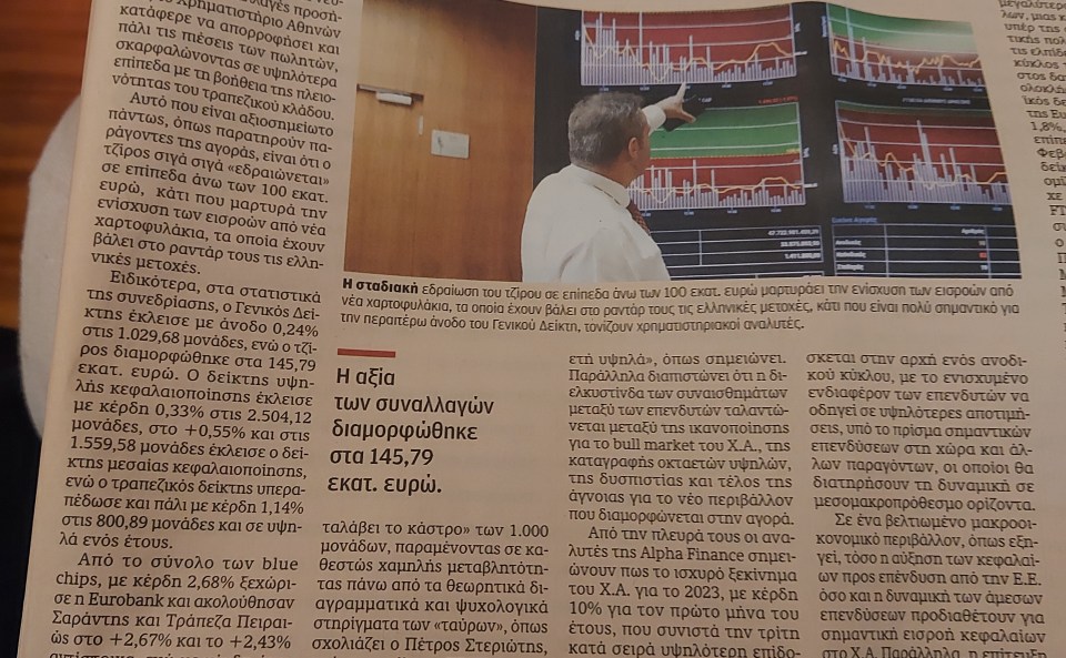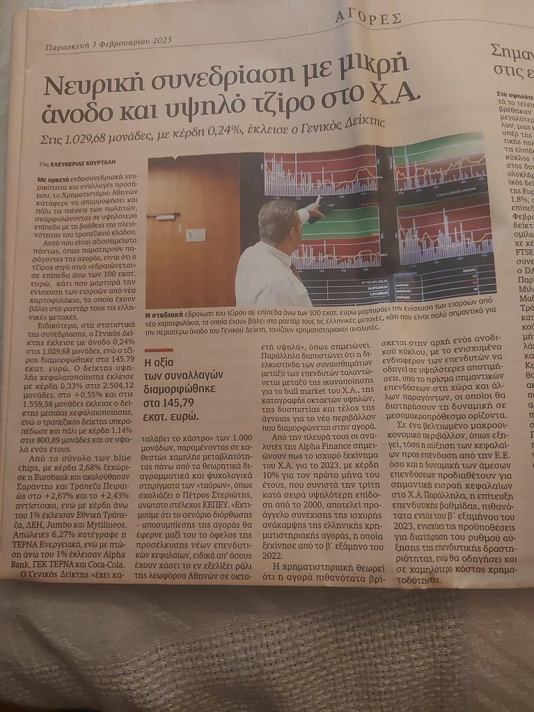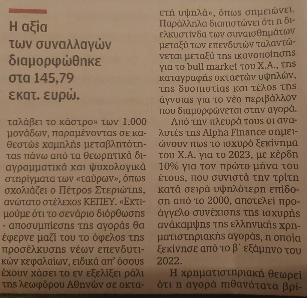 O Γενικός Δείκτης «έχει καταλάβει το κάστρο» των 1.000 μονάδων, παραμένοντας σε καθεστώς χαμηλής μεταβλητότητας πάνω από τα θεωρητικά διαγραμματικά και ψυχολογικά στηρίγματα των «ταύρων», όπως σχολιάζει ο Πέτρος Στεριώτης, ανώτατο στέλεχος ΚΕΠΕΥ. «Εκτιμούμε ότι το σενάριο διόρθωσης – αποσυμπίεσης της αγοράς θα έφερνε μαζί του το όφελος της προσέλκυσης νέων επενδυτικών κεφαλαίων, ειδικά απ’ όσους έχουν χάσει το εν εξελίξει ράλι της λεωφόρου Αθηνών σε οκταετή υψηλά», όπως σημειώνει. Παράλληλα διαπιστώνει ότι η διελκυστίνδα των συναισθημάτων μεταξύ των επενδυτών ταλαντώνεται μεταξύ της ικανοποίησης για το bull market του Χ.Α., της καταγραφής οκταετών υψηλών, της δυσπιστίας και τέλος της άγνοιας για το νέο περιβάλλον που διαμορφώνεται στην αγορά.