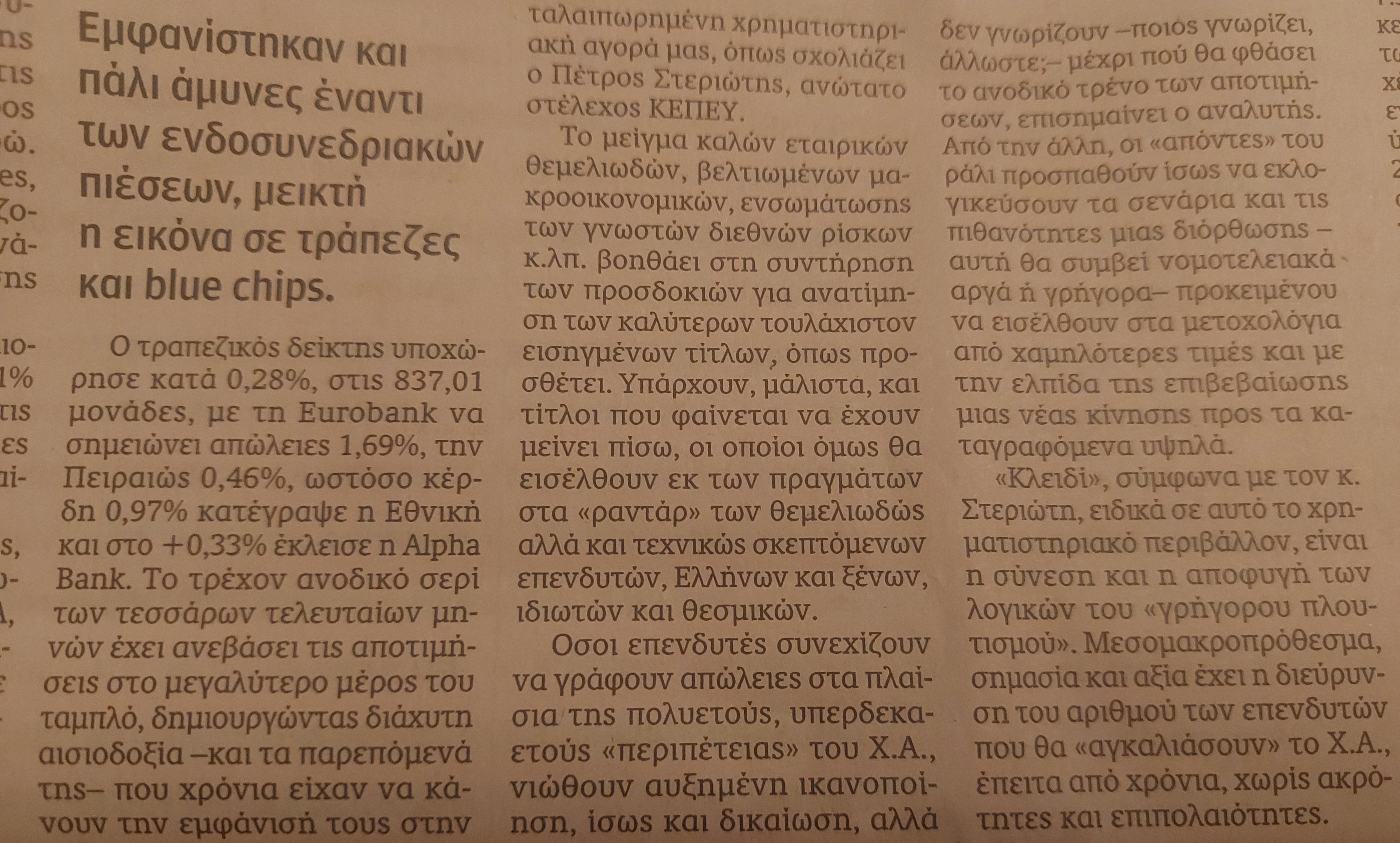 «Κλειδί», σύμφωνα με τον κ. Στεριώτη, ειδικά σε αυτό το χρηματιστηριακό περιβάλλον, είναι η σύνεση και η αποφυγή των λογικών του «γρήγορου πλουτισμού». Μεσομακροπρόθεσμα, σημασία και αξία έχει η διεύρυνση του αριθμού των επενδυτών που θα «αγκαλιάσουν» το Χ.Α., έπειτα από χρόνια, χωρίς ακρότητες και επιπολαιότητες.