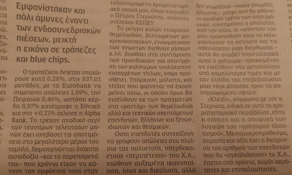Το τρέχον ανοδικό σερί των τεσσάρων τελευταίων μηνών έχει ανεβάσει τις αποτιμήσεις στο μεγαλύτερο μέρος του ταμπλό, δημιουργώντας διάχυτη αισιοδοξία –και τα παρεπόμενά της– που χρόνια είχαν να κάνουν την εμφάνισή τους στην ταλαιπωρημένη χρηματιστηριακή αγορά μας, όπως σχολιάζει ο Πέτρος Στεριώτης, ανώτατο στέλεχος ΚΕΠΕΥ.