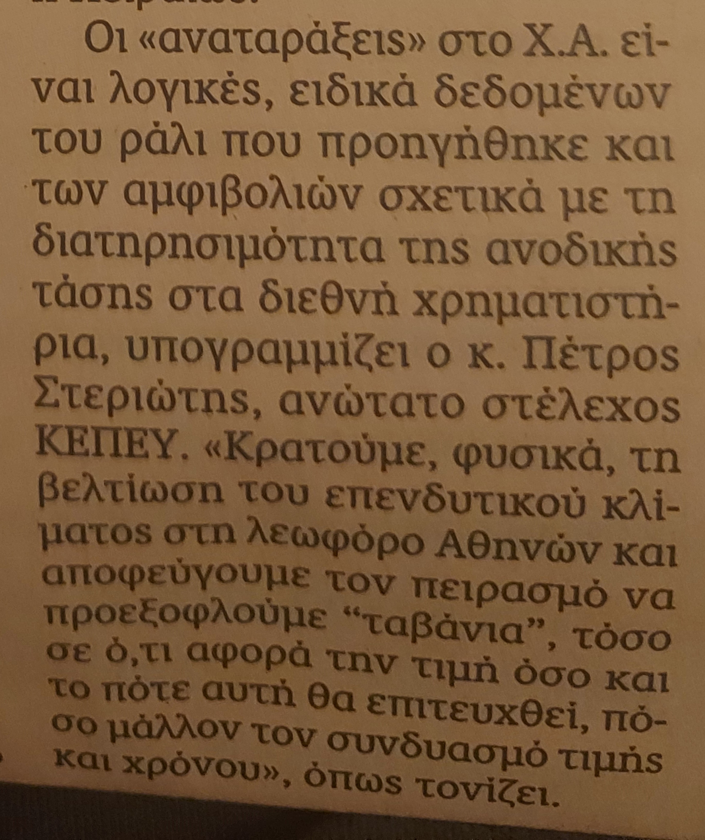 Οι «αναταράξεις» στο Χ.Α. είναι λογικές, ειδικά δεδομένων του ράλι που προηγήθηκε και των αμφιβολιών σχετικά με τη διατηρησιμότητα της ανοδικής τάσης στα διεθνή χρηματιστήρια, υπογραμμίζει ο κ. Πέτρος Στεριώτης, ανώτατο στέλεχος ΚΕΠΕΥ. «Κρατούμε, φυσικά, τη βελτίωση του επενδυτικού κλίματος στη λεωφόρο Αθηνών και αποφεύγουμε τον πειρασμό να προεξοφλούμε “ταβάνια”, τόσο σε ό,τι αφορά την τιμή όσο και το πότε αυτή θα επιτευχθεί, πόσο μάλλον τον συνδυασμό τιμής και χρόνου», όπως τονίζει.