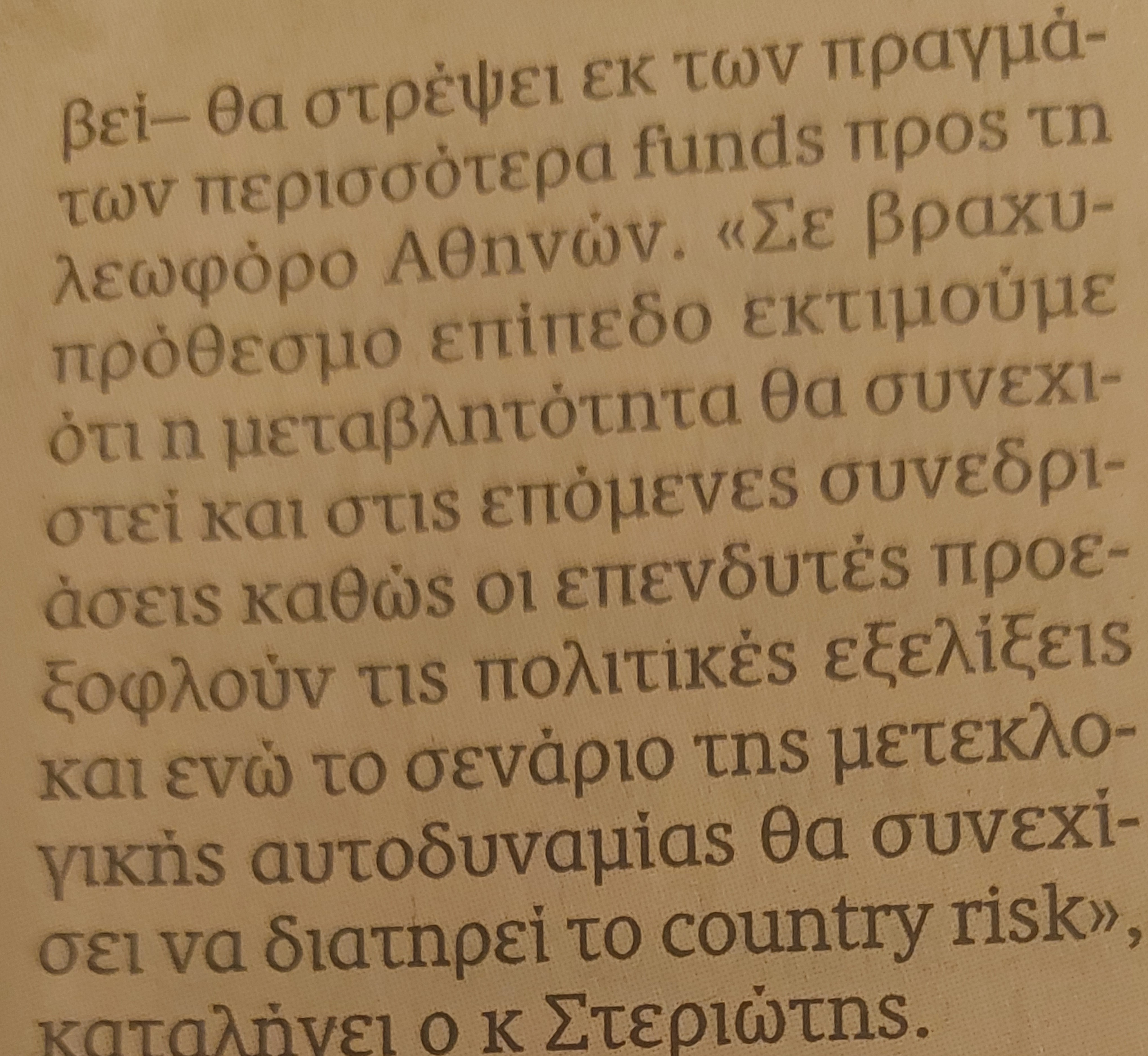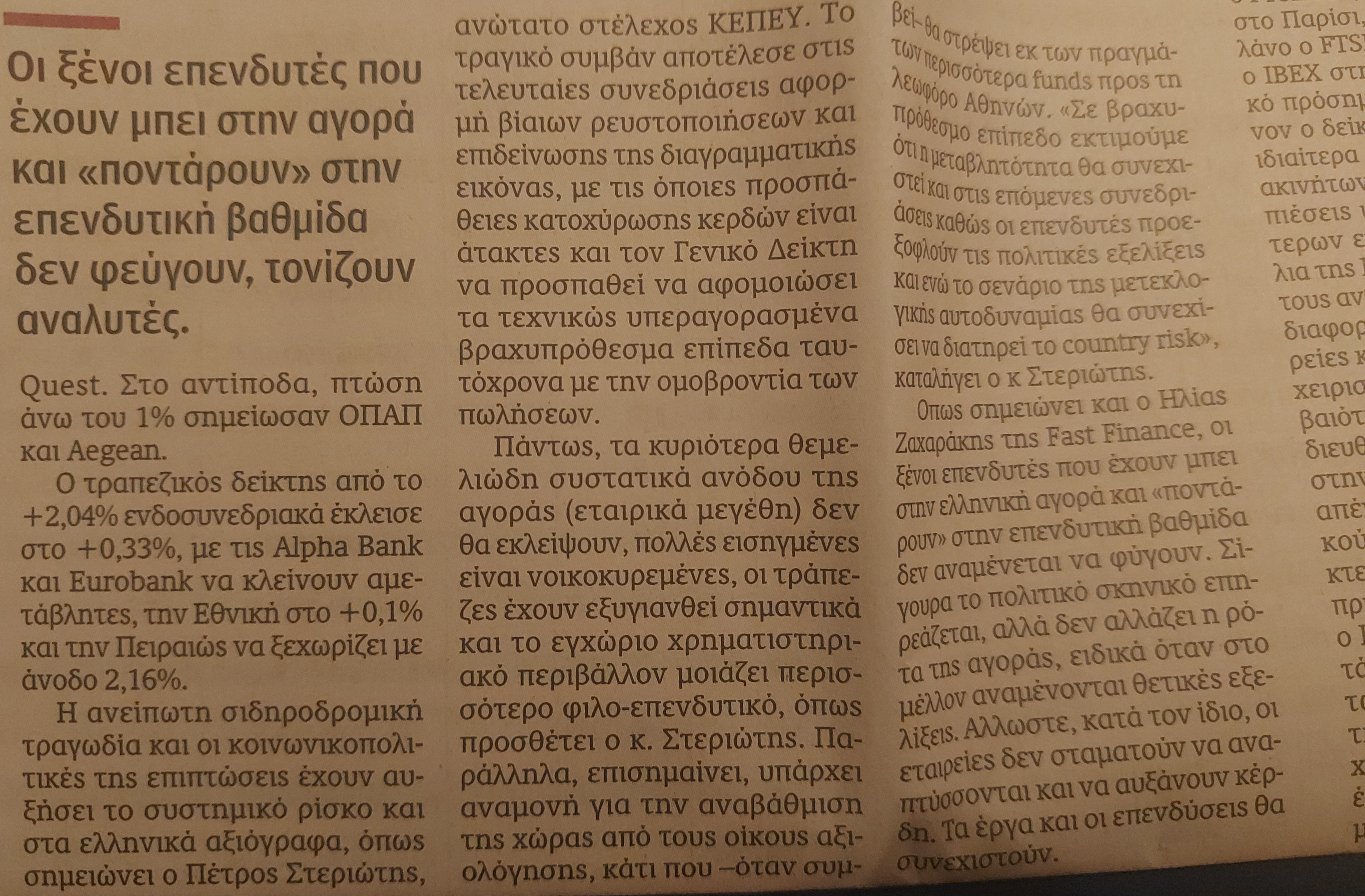 Πάντως, τα κυριότερα θεμελιώδη συστατικά ανόδου της αγοράς (εταιρικά μεγέθη) δεν θα εκλείψουν, πολλές εισηγμένες είναι νοικοκυρεμένες, οι τράπεζες έχουν εξυγιανθεί σημαντικά και το εγχώριο χρηματιστηριακό περιβάλλον μοιάζει περισσότερο φιλο-επενδυτικό, όπως προσθέτει ο κ. Στεριώτης. Παράλληλα, επισημαίνει, υπάρχει αναμονή για την αναβάθμιση της χώρας από τους οίκους αξιολόγησης, κάτι που –όταν συμβεί– θα στρέψει εκ των πραγμάτων περισσότερα funds προς τη λεωφόρο Αθηνών. «Σε βραχυπρόθεσμο επίπεδο εκτιμούμε ότι η μεταβλητότητα θα συνεχιστεί και στις επόμενες συνεδριάσεις καθώς οι επενδυτές προεξοφλούν τις πολιτικές εξελίξεις και ενώ το σενάριο της μετεκλογικής αυτοδυναμίας θα συνεχίσει να διατηρεί το country risk», καταλήγει ο κ Στεριώτης.