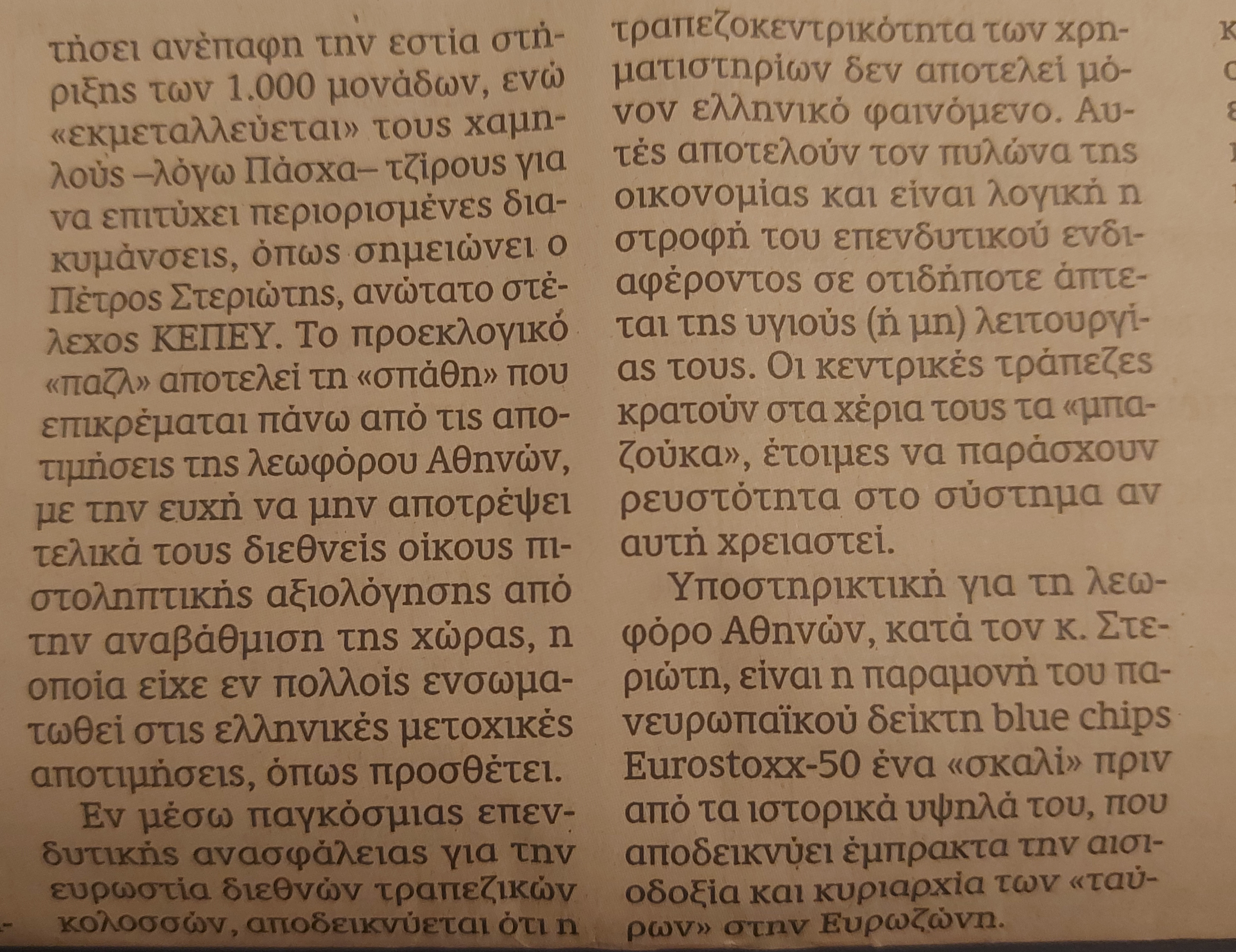 Ο Γενικός Δείκτης έχει κρατήσει ανέπαφη την εστία στήριξης των 1.000 μονάδων, ενώ «εκμεταλλεύεται» τους χαμηλούς –λόγω Πάσχα– τζίρους για να επιτύχει περιορισμένες διακυμάνσεις, όπως σημειώνει ο Πέτρος Στεριώτης, ανώτατο στέλεχος ΚΕΠΕΥ. Το προεκλογικό «παζλ» αποτελεί τη «σπάθη» που επικρέμαται πάνω από τις αποτιμήσεις της λεωφόρου Αθηνών, με την ευχή να μην αποτρέψει τελικά τους διεθνείς οίκους πιστοληπτικής αξιολόγησης από την αναβάθμιση της χώρας, η οποία είχε εν πολλοίς ενσωματωθεί στις ελληνικές μετοχικές αποτιμήσεις, όπως προσθέτει.