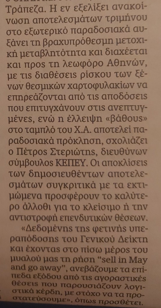 «Δεδομένης της φετινής υπεραπόδοσης του Γενικού Δείκτη και έχοντας στο πίσω μέρος του μυαλού μας τη ρήση “sell in May and go away”, ανεβάζουμε τα επίπεδα εξόδου από τις αγοραστικές θέσεις που παρουσιάζουν λογιστικά κέρδη, με στόχο να τα προστατεύσουμε», όπως προσθέτει.