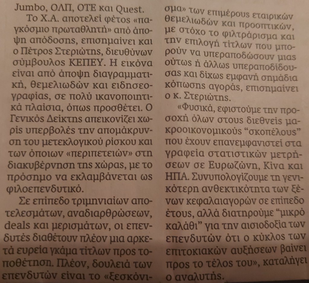 Το Χ.Α. αποτελεί φέτος «παγκόσμιο πρωταθλητή» από άποψη απόδοσης, επισημαίνει και ο Πέτρος Στεριώτης, διευθύνων σύμβουλος ΚΕΠΕΥ. Η εικόνα είναι από άποψη διαγραμματική, θεμελιωδών και ειδησεογραφίας, σε πολύ ικανοποιητικά πλαίσια, όπως προσθέτει. Ο Γενικός Δείκτης απεικονίζει χωρίς υπερβολές την απομάκρυνση του μετεκλογικού ρίσκου και των όποιων «περιπετειών» στη διακυβέρνηση της χώρας, με το πρόσημο να εκλαμβάνεται ως φιλοεπενδυτικό.