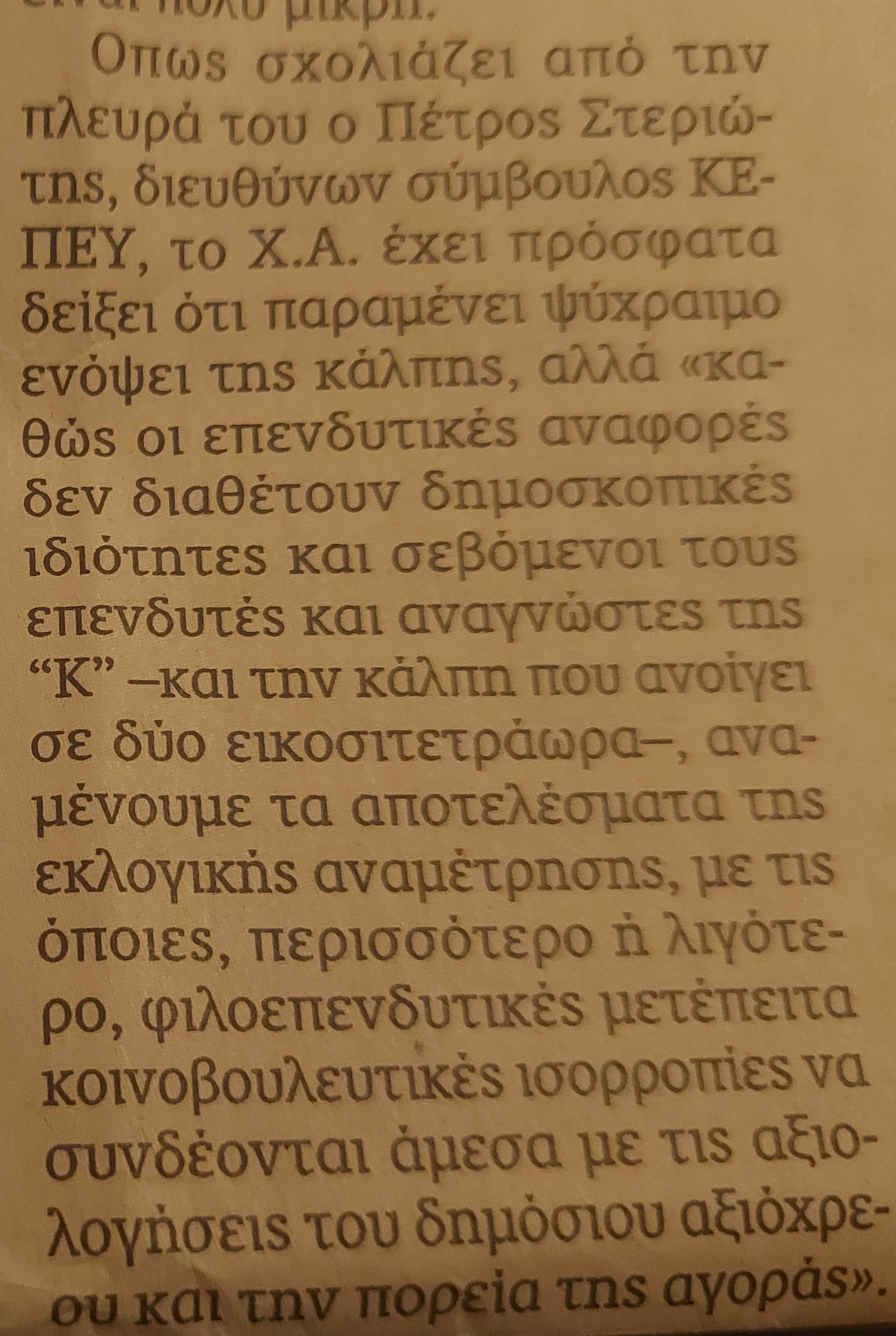 Από την πλευρά του ο Πέτρος Στεριώτης, ανώτατο στέλεχος ΚΕΠΕΥ, επισημαίνει πως οι παγκόσμιες κεφαλαιαγορές συνεχίζουν να ταλανίζονται από δραματικά υψηλή διακυμανσιμότητα σε επενδυτικό περιβάλλον «sell in May and go away», που επηρεάζει μετοχές, ομόλογα και βιομηχανικά μέταλλα.