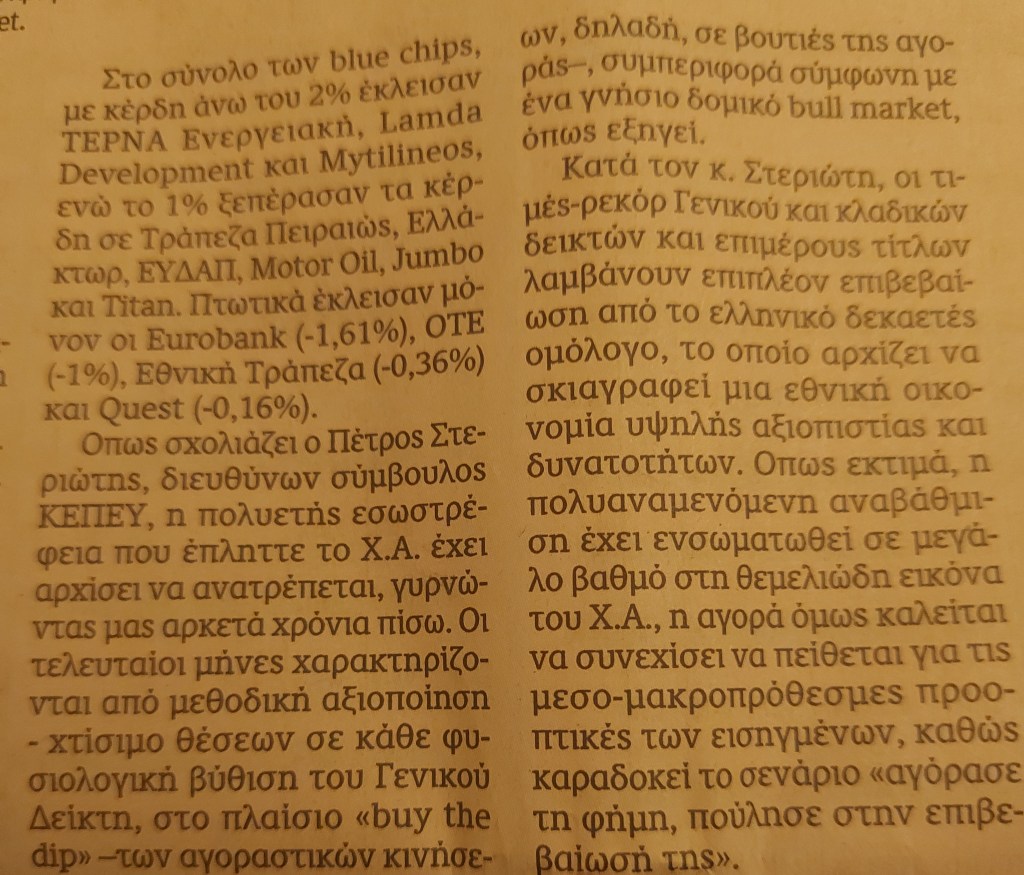 Οπως σχολιάζει ο Πέτρος Στεριώτης, διευθύνων σύμβουλος ΚΕΠΕΥ, η πολυετής εσωστρέφεια που έπληττε το Χ.Α. έχει αρχίσει να ανατρέπεται, γυρνώντας μας αρκετά χρόνια πίσω. Οι τελευταίοι μήνες χαρακτηρίζονται από μεθοδική αξιοποίηση – χτίσιμο θέσεων σε κάθε φυσιολογική βύθιση του Γενικού Δείκτη, στο πλαίσιο «buy the dip» –των αγοραστικών κινήσεων, δηλαδή, σε βουτιές της αγοράς–, συμπεριφορά σύμφωνη με ένα γνήσιο δομικό bull market, όπως εξηγεί.