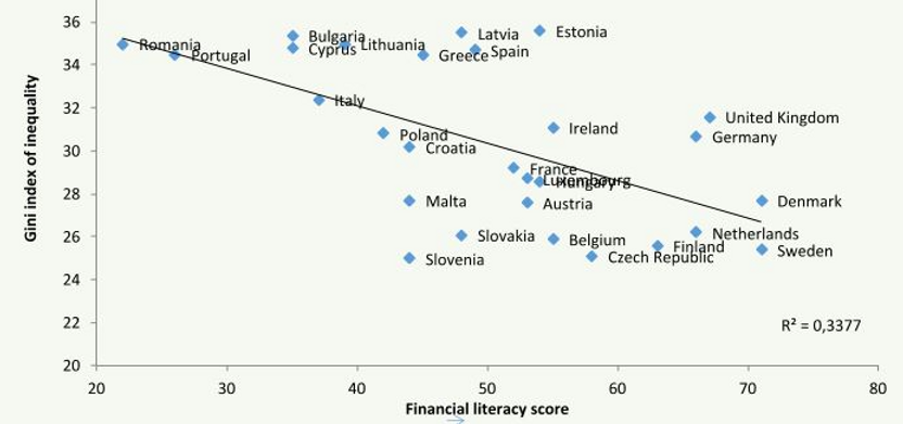 Οικονομικός εγγραμματισμός και ανισότητα: Οι κοινωνικές ανισότητες είναι χαμηλότερες σε χώρες υψηλότερου οικονομικού εγγραμματισμού (Πηγές: S&P Global FinLitSurvey και Eurostat)