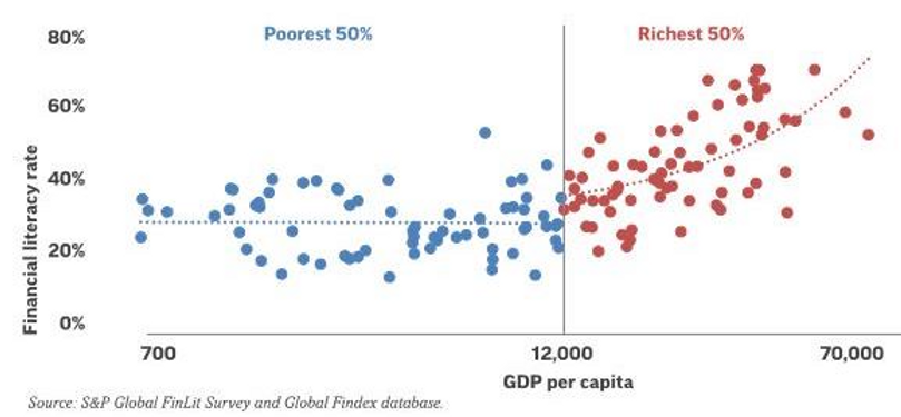 Η έρευνα της Standard & Poor’s,η οποία μέτρησε τον οικονομικό αλφαβητισμό σε διάφορες χώρες του κόσμου, με βάση τη γνώση των ερωτηθέντων για τις έννοιες του πληθωρισμού, των επιτοκίων και του ρίσκου, κατέγραψε τη θετική σχέση ανάμεσα στο κατά κεφαλήν ΑΕΠ και στα επίπεδα οικονομικού αλφαβητισμού των διαφόρων χωρών (βλ. Γράφημα 1).