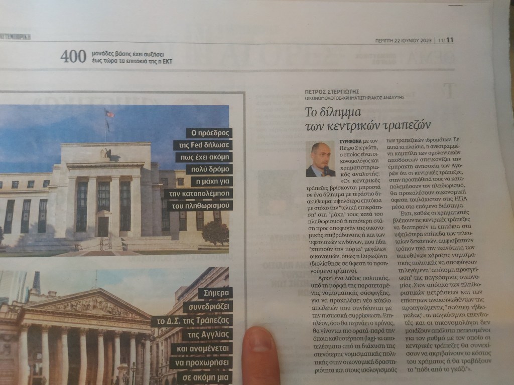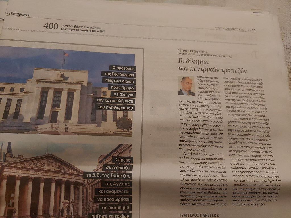 Οι κεντρικές τράπεζες βρίσκονται μπροστά σε ένα δίλημμα με τεράστιο διακύβευμα: υψηλότερα επιτόκια με στόχο την «τελική επικράτηση» στη «μάχη» τους κατά του πληθωρισμού ή ηπιότερη στάση προς αποφυγήν της οικονομικής επιβράδυνσης ή και των υφεσιακών κινδύνων, που ήδη «χτυπούν την πόρτα» μεγάλων οικονομιών, όπως η Ευρωζώνη (διολίσθησε σε ύφεση το προηγούμενο τρίμηνο).