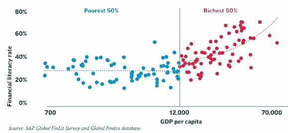 Η έρευνα της Standard & Poor’s,η οποία μέτρησε τον οικονομικό αλφαβητισμό σε διάφορες χώρες του κόσμου, με βάση τη γνώση των ερωτηθέντων για τις έννοιες του πληθωρισμού, των επιτοκίων και του ρίσκου, κατέγραψε τη θετική σχέση ανάμεσα στο κατά κεφαλήν ΑΕΠ και στα επίπεδα οικονομικού αλφαβητισμού των διαφόρων χωρών (βλ. Γράφημα 1).