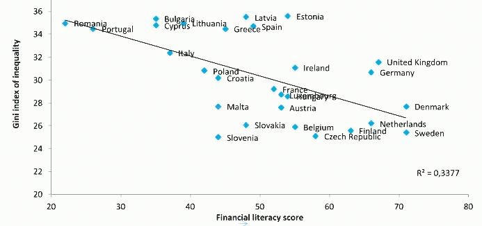 Θα μπορούσαμε εύλογα να συμπεράνουμε ότι η σχέση μεταξύ του βιοτικού επιπέδου και του χρηματοοικονομικού αλφαβητισμού των διαφόρων χωρών είναι αμφίδρομη. Ιδιαίτερα χαρακτηριστικό είναι το “χάσμα” μεταξύ ευρωπαϊκού «Βορρά» και ευρωπαϊκού «Νότου» (βλ. Γράφημα 2).
