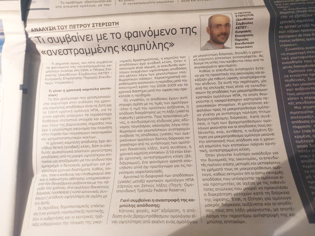 Tι σημαίνει όμως, και πότε συμβαίνει το φαινόμενο της «ανεστραμμένης καμπύλης» αναλύει στη DEAL ο Πέτρος Στεριώτης (Διευθύνων Σύμβουλος KEΠEY – Kυπριακής Eπιχείρησης Παροχής Eπενδυτικών Yπηρεσιών)