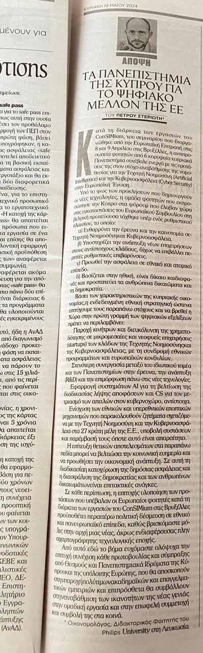 Κατά τη διάρκεια των εργασιών του ConSIMium, του σεμιναρίου που διοργανώθηκε από την Ευρωπαϊκή Επιτροπή στις 8 και 9 Απριλίου στις Βρυξέλλες, η αντιπροσωπεία φοιτητών από 6 κορυφαία κυπριακά Πανεπιστήμια συνέβαλε ενεργά με τις προτάσεις της στον στόχο αναβάθμισης της νομοθεσίας για την Τεχνητή Νοημοσύνη (Artificial Intelligence) και την Κυβερνοασφάλεια (Cyber Security) στην Ευρωπαϊκή Ένωση.