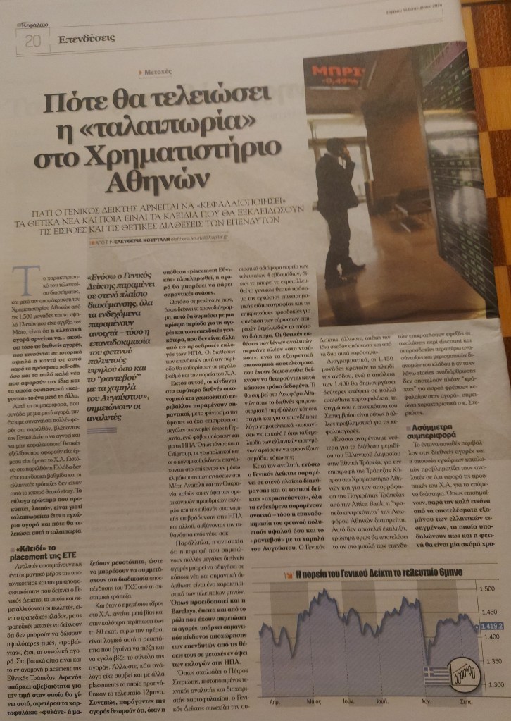 Δημοσιεύτηκε την 6 Οκτωβρίου 2024 «Κεφάλαιο» (έντυπη έκδοση της εφημερίδας) (14/9/2024) Κοινοποίηση: Μοιραστείτε στο X(Ανοίγει σε νέο παράθυρο) Χ Mοιραστείτε στο Facebook(Ανοίγει σε νέο παράθυρο) Facebook Μου αρέσει! Φόρτωση...