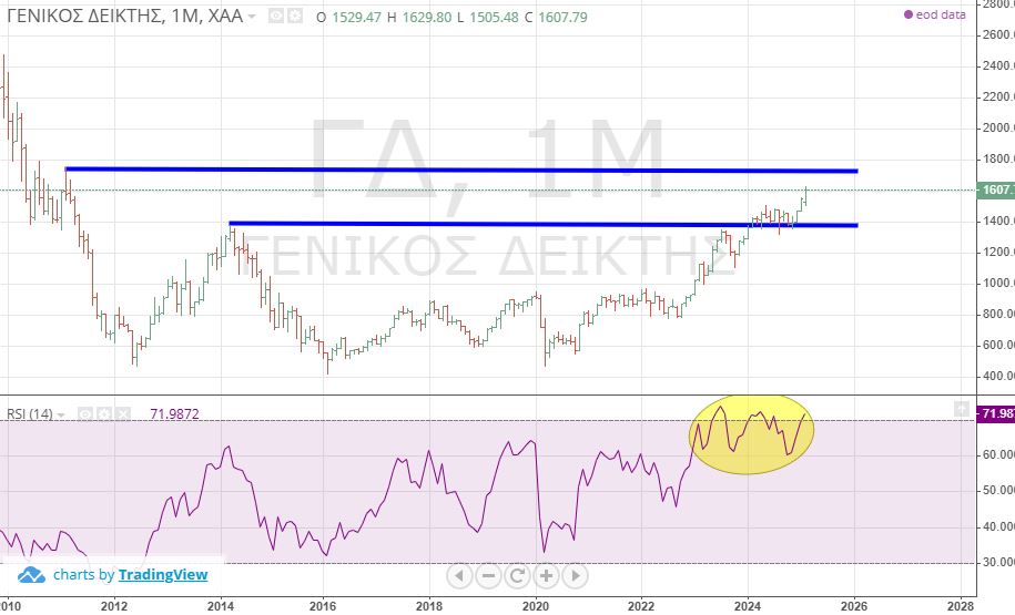 1. ΓΕΝΙΚΟΣ ΔΕΙΚΤΗΣ Αθήνας (14 χρόνια) Σε υψηλό 14 ετών αλλά με τον μηνιαίο ταλαντωτή RSI να είναι υπεραγορασμένος.